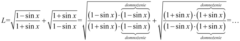Przykład 111[kliknij aby rozwinąć] Założenie: Żaden z mianowników musi być różny od zera, a wyrażenia znajdujące się pod pierwiastkiem muszą mieć wartość większą bądź równą od zera. Od razu przestrzegam przed skracaniem typu Lewa strona tożsamości jest dłuższa, zatem to ona będzie podlegać przekształceniom. W przykładzie nie ma niestety żadnych charakterystycznych wzorów, które pozwolą na jego uproszczenie, można oczywiście rozpisać jedynki ze wzoru W przykładzie tym trzeba użyć pewnego triku tzn. domnożyć liczniki lub mianowniki obydwu ułamków przez wyrażenie z przeciwnym znakiem, aby otrzymać przekształconą jedynkę trygonometryczną. Zostaną przedstawione dwa sposoby – pierwszy z domnożeniem mianownika i drugi (nieco dłuższy) z domnożeniem licznika. I sposób Zaczniemy od wymnożenia mianowników obydwu ułamków przez wyrażenie z przeciwnym znakiem, oczywiście identyczne wyrażenie trzeba dopisać w liczniku, ponieważ tylko wtedy nie zmieni się wartość ułamka. Pamiętajmy o używaniu nawiasów, lepiej napisać ich więcej niż mniej: Teraz uprościmy obydwa mianowniki pozbywając się nawiasów. Można to zrobić „na piechotę” kolejno wymnażając składniki lub stosując wzór skróconego mnożenia Kolejny etap stanowi likwidacja pierwiastków i tutaj niezbędna okaże się znajomość wzorów związanych z wartością bezwzględną. Na początku skorzystamy z własności działań na pierwiastkach tzn. Teraz skorzystamy z własności Kolejnym krokiem będzie likwidacja wartości bezwzględnej (modułu) tam, gdzie jest to możliwe bez dodatkowych założeń, które jak widać nie były podane w przykładzie. Do tego niezbędna jest znajomość wartości, jakie osiąga funkcja sinus i cosinus. Sinus, a także cosinus osiągają wartości wyłącznie ze zbioru np. np. np. np. np. np. np. np. np. Moduł działa w następujący sposób: w przypadku liczb dodatnich i zera nie dzieje się nic, natomiast liczby ujemne są zamieniane na dodatnie przez „wybijanie” minusa z wyniku drugim minusem np. Przy opuszczaniu modułu tam, gdzie wynik był zawsze na plusie bądź równy zero nie trzeba zmieniać znaków, tylko zamieniamy moduł na zwykły nawias, aby nie pogubić znaków przy wykonywaniu późniejszych działań (tu akurat nie ma takiego niebezpieczeństwa), natomiast w przypadku cosinusa nie możemy opuścić modułu bez dodatkowych założeń, ponieważ w zależności od liczby podstawianej za cosinus wynik jest dodatni albo ujemny (raz wybijamy minus, raz nie). Zatem wracając do tożsamości otrzymujemy: Mamy już wspólny mianownik, także można zapisać wszystko na jednej kresce ułamkowej i opuścić nawiasy w liczniku: II sposób Jest to bardziej pracochłonny sposób, ale zasada jest identyczna jak wcześniej. Zaczniemy od domnożenia tym razem liczników przez wyrażenie z przeciwnym znakiem. Oczywiście mianowniki również należy wymnożyć, ponieważ tylko wtedy wartość wyrażenia nie ulegnie zmianie. Pamiętajmy o nawiasach: Teraz uprościmy obydwa liczniki pozbywając się nawiasów. Można to zrobić „na piechotę” kolejno wymnażając składniki lub stosując wzór skróconego mnożenia Kolejny etap stanowi likwidacja pierwiastków i tutaj niezbędna okaże się znajomość wzorów związanych z wartością bezwzględną. Na początku skorzystamy z własności działań na pierwiastkach tzn. Teraz skorzystamy z własności Wyjaśnienie dotyczące opuszczania modułów znajduje się w sposobie I i jest identyczne, także od razu przejdziemy do wyniku: Po prawej stronie do której uzyskania dążymy mamy tylko jedną kreską ułamkową, zatem obydwa ułamki sprowadzamy do wspólnego mianownika: Jak widać nie ma możliwości skracania, ponieważ w liczniku jest znak dodawania, który nie jest zamknięty w nawiasie, zatem pozbędziemy się nawiasów z licznika i mianownika. W mianowniku można wymnożyć nawiasy korzystając ponownie ze wzoru skróconego mnożenia Wynik jest nieco podobny do prawej strony tożsamości, ale w liczniku mamy Teraz rozpiszemy kwadrat cosinusa w mianowniku na iloczyn dwóch cosinusów: I skorzystamy z własności wartości bezwzględnej |
